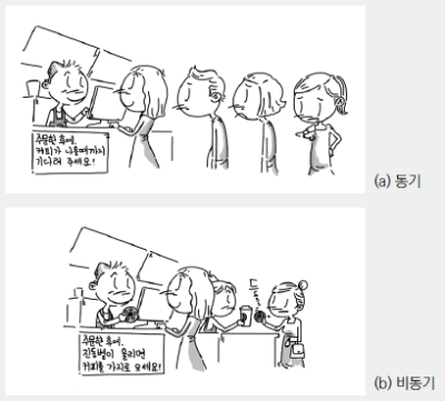 위 그림의 (a)처럼 커피 주문을 받고 나올 때까지 기다리는 것이 동기 방식의 예시라고 할 수 있다.