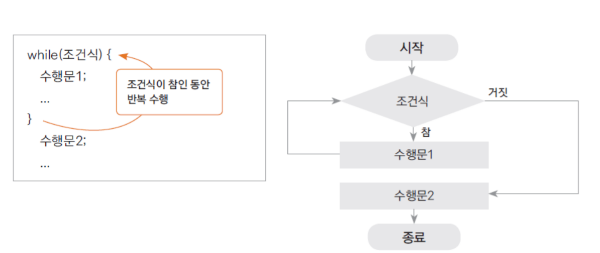 - 주어진 조건에 맞는 동안(true) 지정된 수행문을 반복적으로 수행하는 제어문