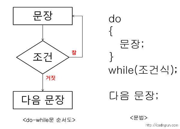 - while문은 조건을 먼저 체크하고 반복 수행이 된다면, do-while은 조건과 상관 없이 수행을 한 번 하고나서 조건을 체크.