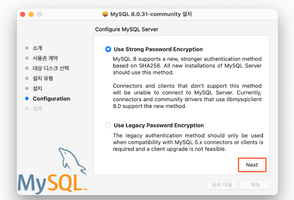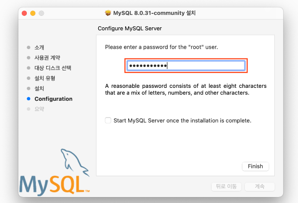 MySQL을 설치하면 가장 처음에 root라는 사용자가 기본으로 준비되어 있다. 우리는 이 root 사용자로 서버에 접속하면 되는데, 이때 비밀번호가 필요하다. 원하는 대로 비밀번호를 입력하면 된다. 대신, 나중에 다시 사용해야 하니까 절대 잊어버리면 안 된다.